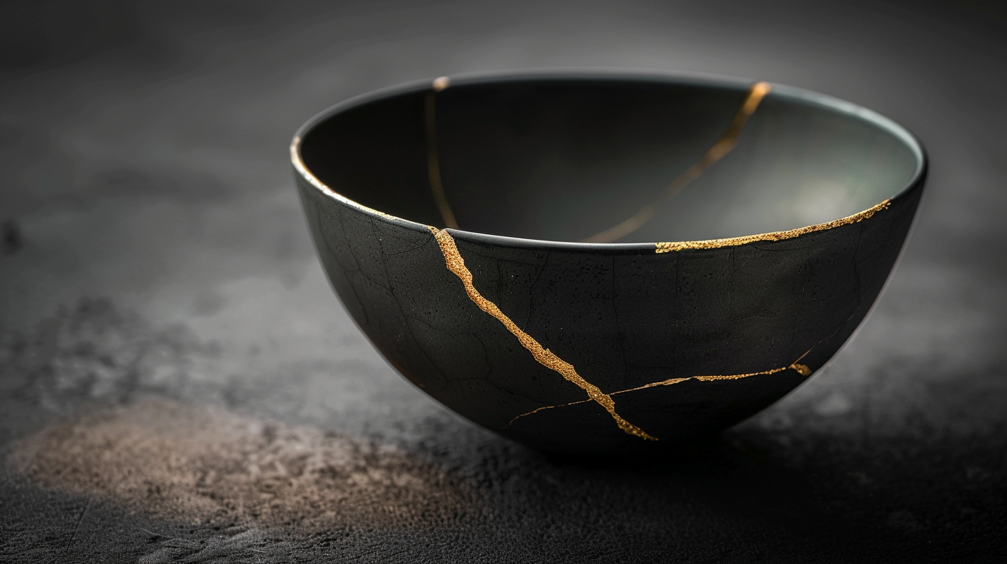 割れや欠けた陶磁器を漆で接着し、継ぎ目に金粉を施して修復する日本の伝統技法。傷を隠すのではなく金で輝かせることで「壊れた歴史もまた美しさの一部」とする侘び寂びの精神を体現しています。