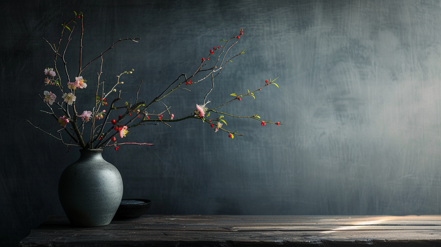 生け花において最も大切にされるのは「間(ま)」。花と花の間の空間、枝の伸びる方向、器との対話。そのすべてが一つの作品を構成します。花を足すのではなく、引くことで完成に近づくという逆説的な美意識が宿っています。